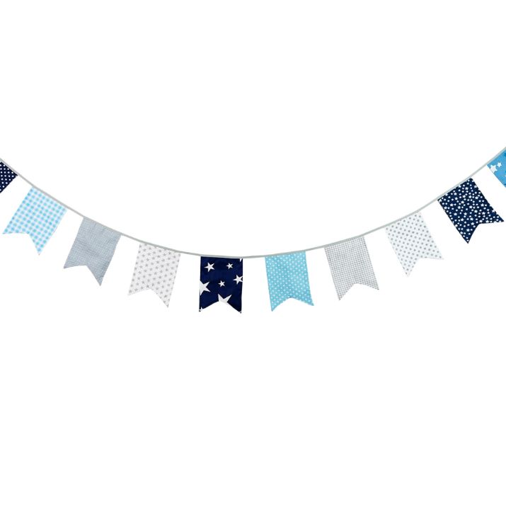 Гирлянда состоит из 12 флажков, общая длина составляет 3,4 м, расстояние между флажками 3 см, длина матерчатых флажков 2,1 м, длина лямок с обеих сторон по 50 см