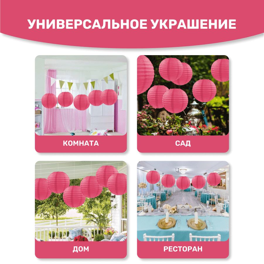 В комплект входит 8 бумажных фонариков и лента атласная.